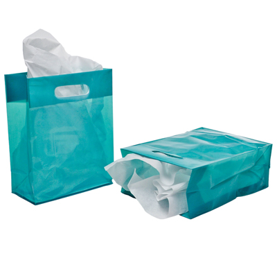 Transparent bag has die-cut handles reinforced with chipboard for added durability. Gussets allow bag to stand even when unfilled. Chipboard bottom provides extra support.
