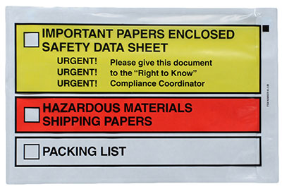 The pressure-sensitive adhesive attaches to paper, metal, wood, corrugated, or plastic. Back-loading envelopes have a tamper-evident pocket and must be cut open to retrieve documents. Made from low density polyethylene. Open end is first dimension listed.