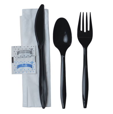 Medium-weight plastic utensils are durable, and disposable. Wrapped set includes black plastic fork, knife, spoon, napkin, and salt and pepper packets.